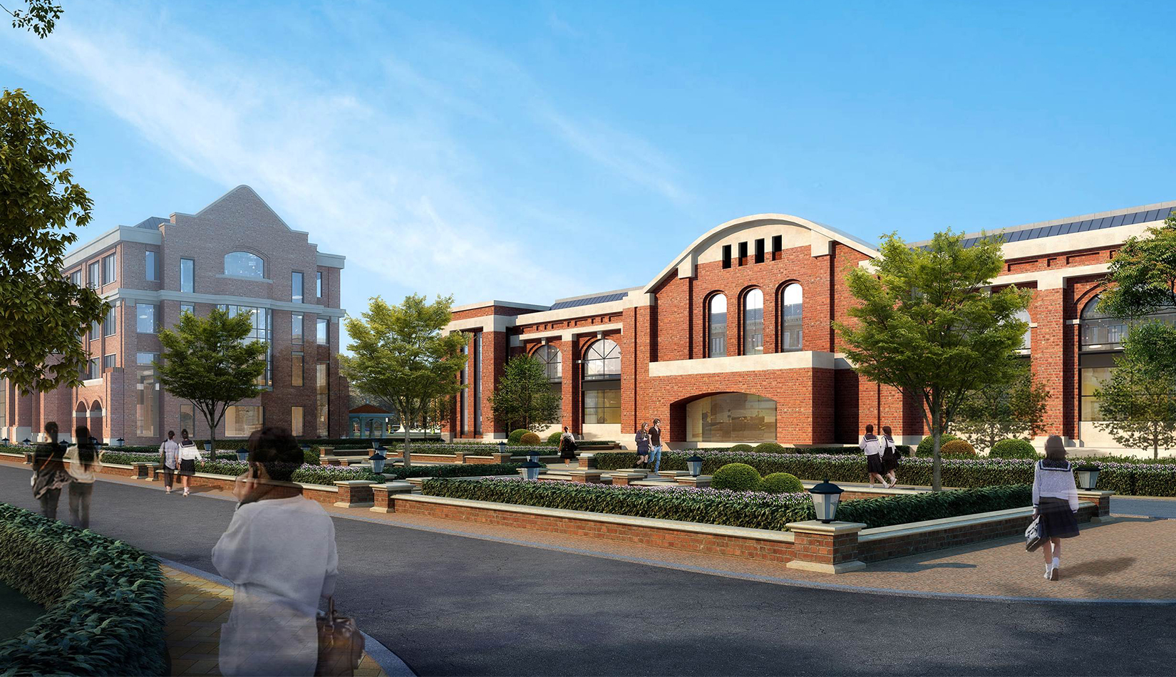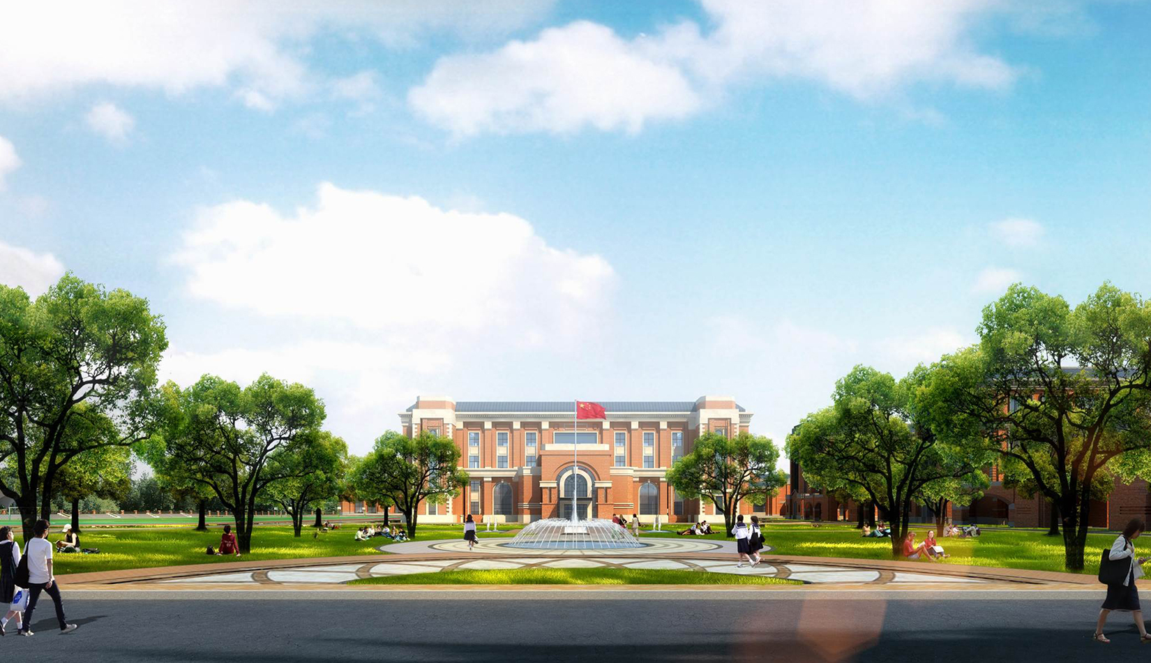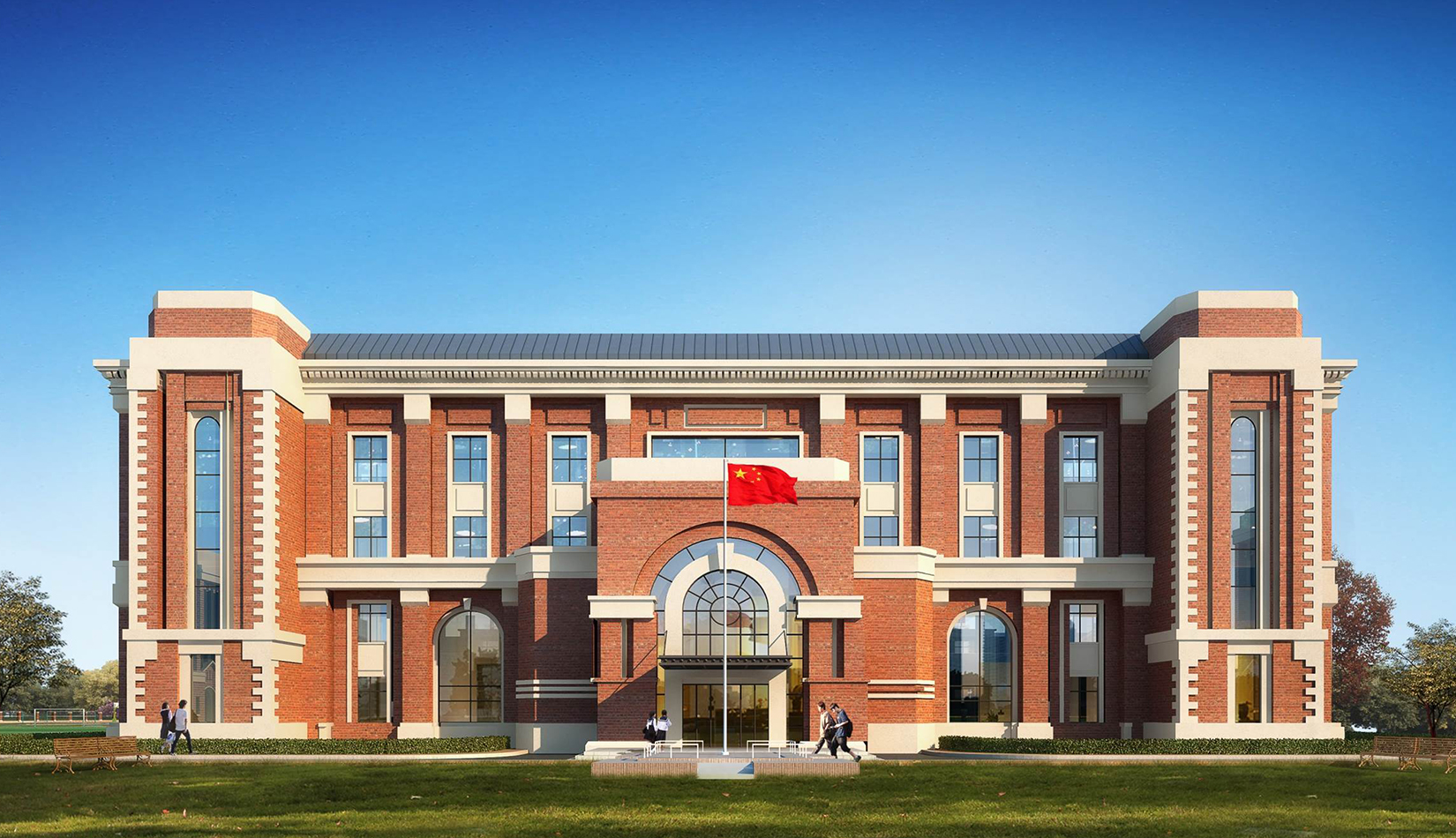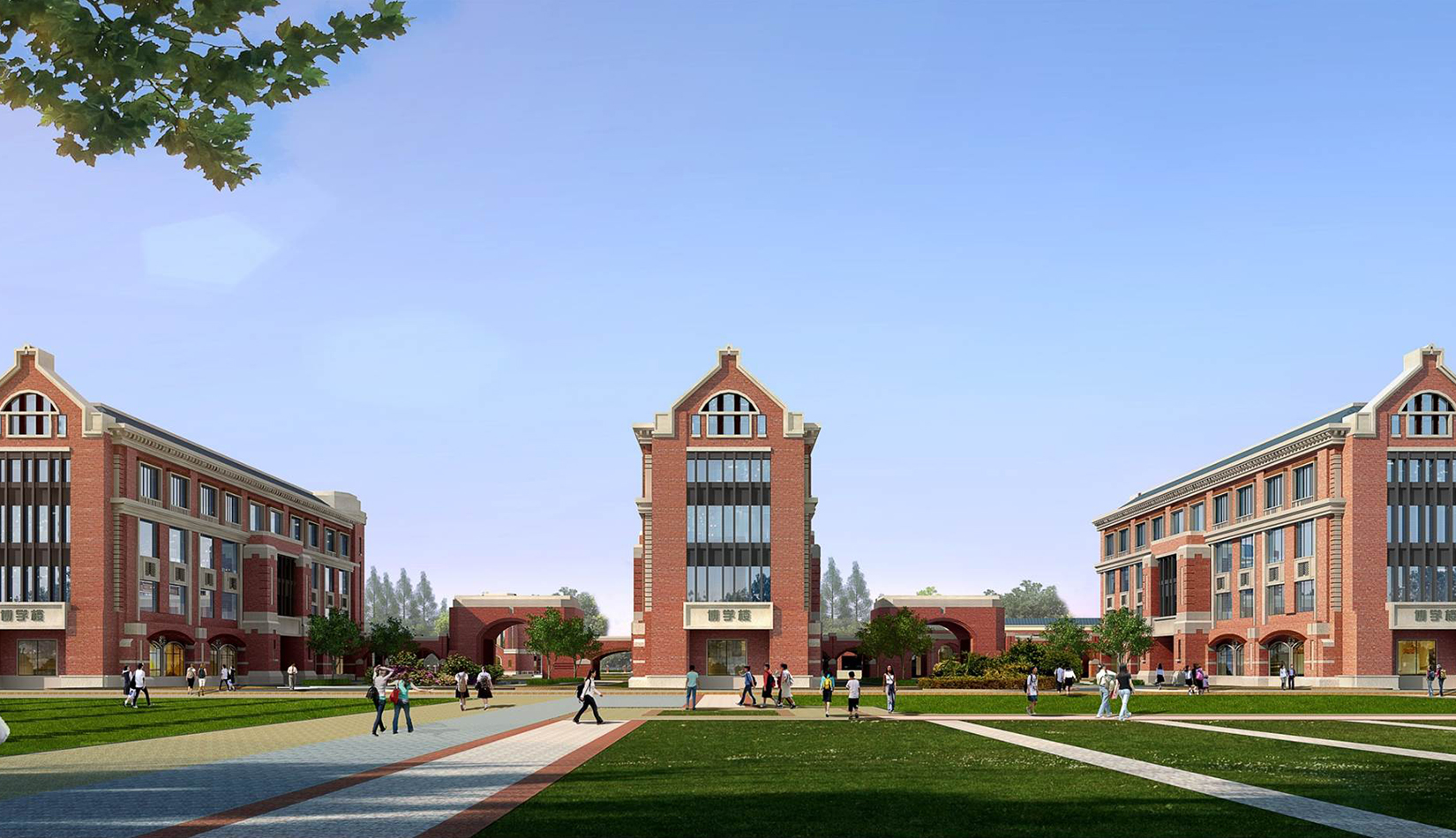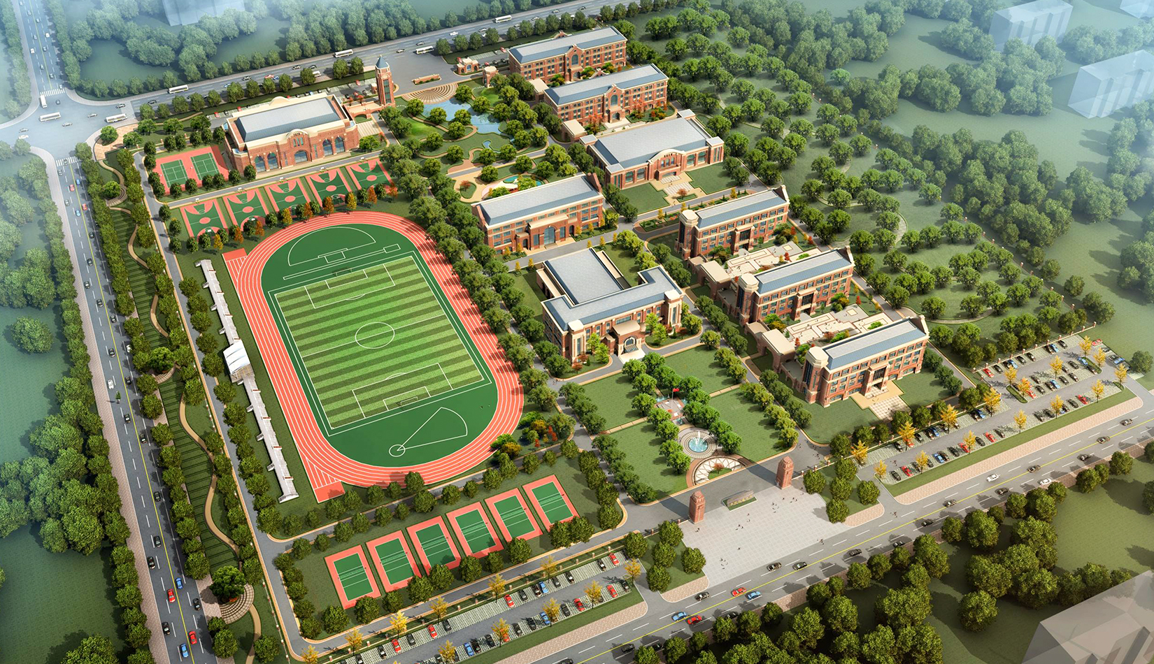 分區(qū)設(shè)計上,采用了“前場后園”的設(shè)計手法。前區(qū)以教學區(qū)為主,圍繞中心圖書綜合樓形成前區(qū)禮儀性廣場,同時以中軸對稱為原則,體現(xiàn)了教學的嚴肅性與秩序性;各個教學單元以年級、功能就近布置為基本原則,以中國傳統(tǒng)的“院落”形式進行組合,后院生活區(qū)借鑒了“山水園林”的布局手法,結(jié)合中心景觀,進行自由化布局,達到景入園中、人在景中生活場景,使學生在學習之余,得到充分的放松。