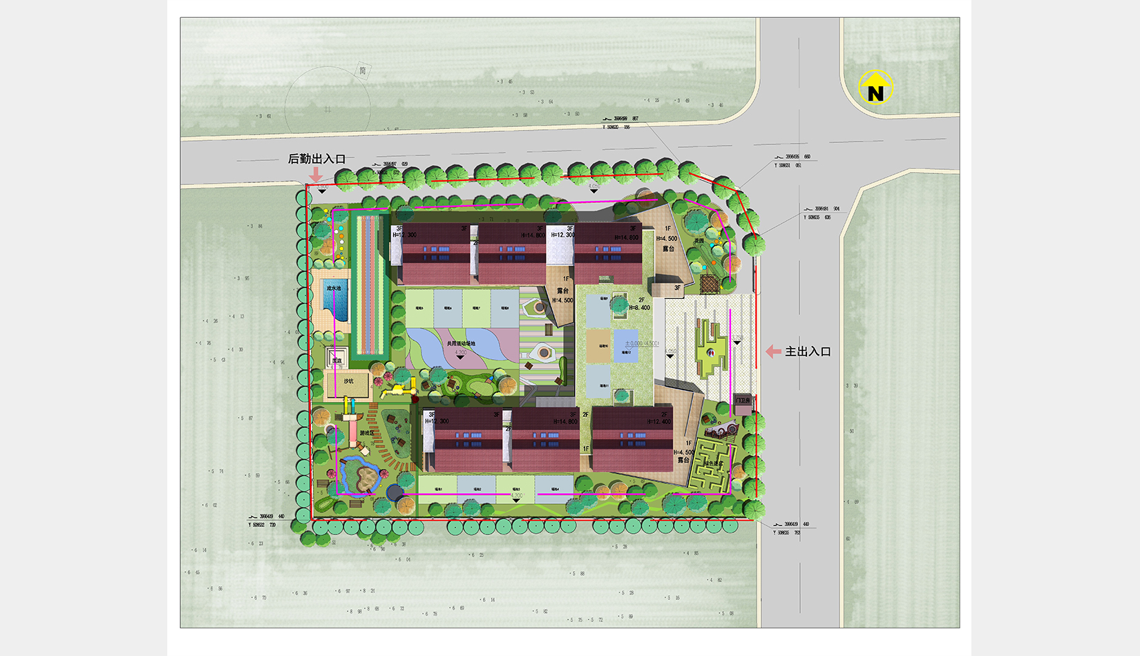 建筑造型來源于兒童最初對房子的印象并進行延伸,加上積木搭接形態(tài),形成C字形圍合的主體建筑,就像父母溫暖的懷抱;建筑造型跟兒童產(chǎn)生很好的親切感,讓兒童將上幼兒園成為快樂的事情。同時形態(tài)結(jié)合地緣文化特色,采用雙折坡屋頂,寓意展翅翱翔的海鷗。