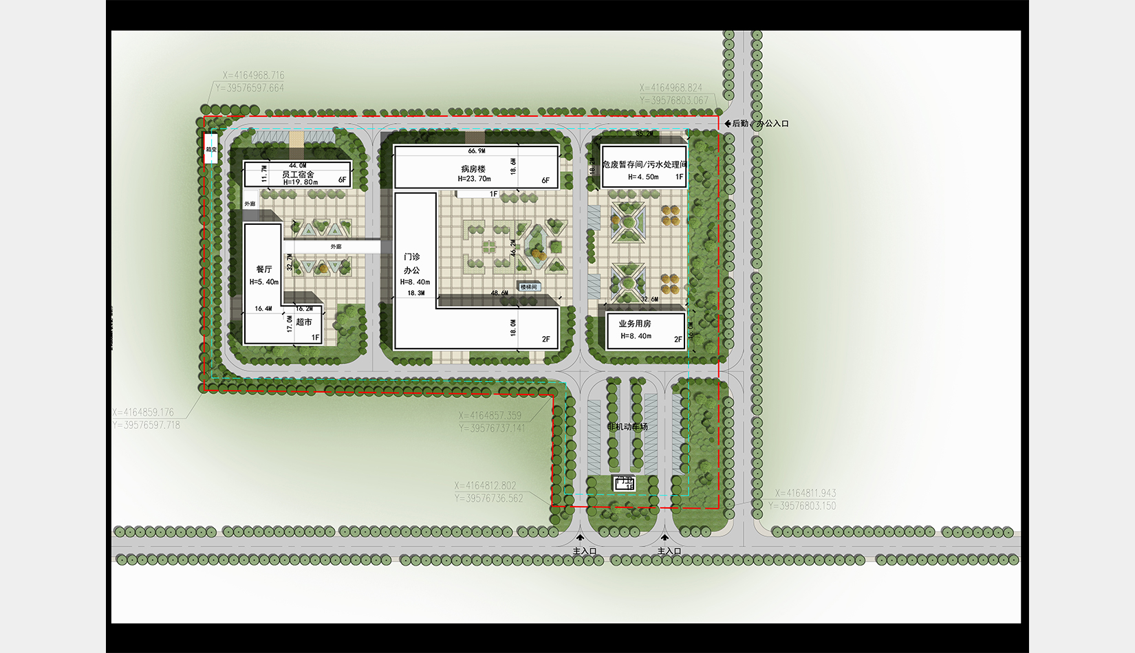 景觀設(shè)計(jì)采用圍合、穿插、滲透等設(shè)計(jì)手法,營造公園式景觀綠化,與建筑群體融合呼應(yīng),打造一個會呼吸多元化的綠色醫(yī)院,利用建筑之間的圍合關(guān)系,創(chuàng)造動態(tài)的具有生命力的局部景觀。