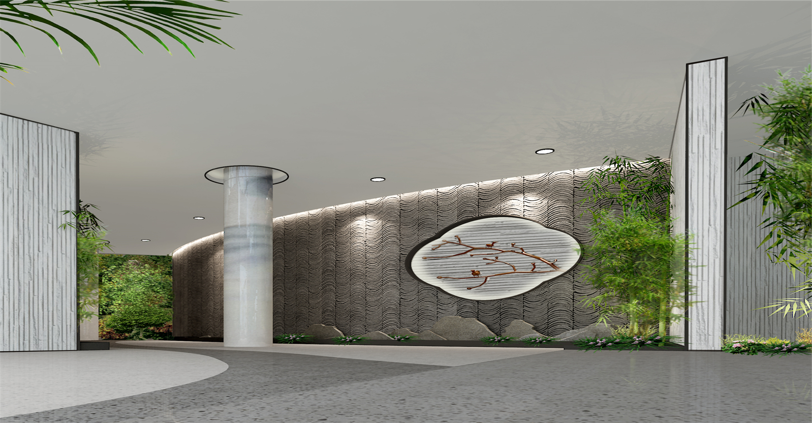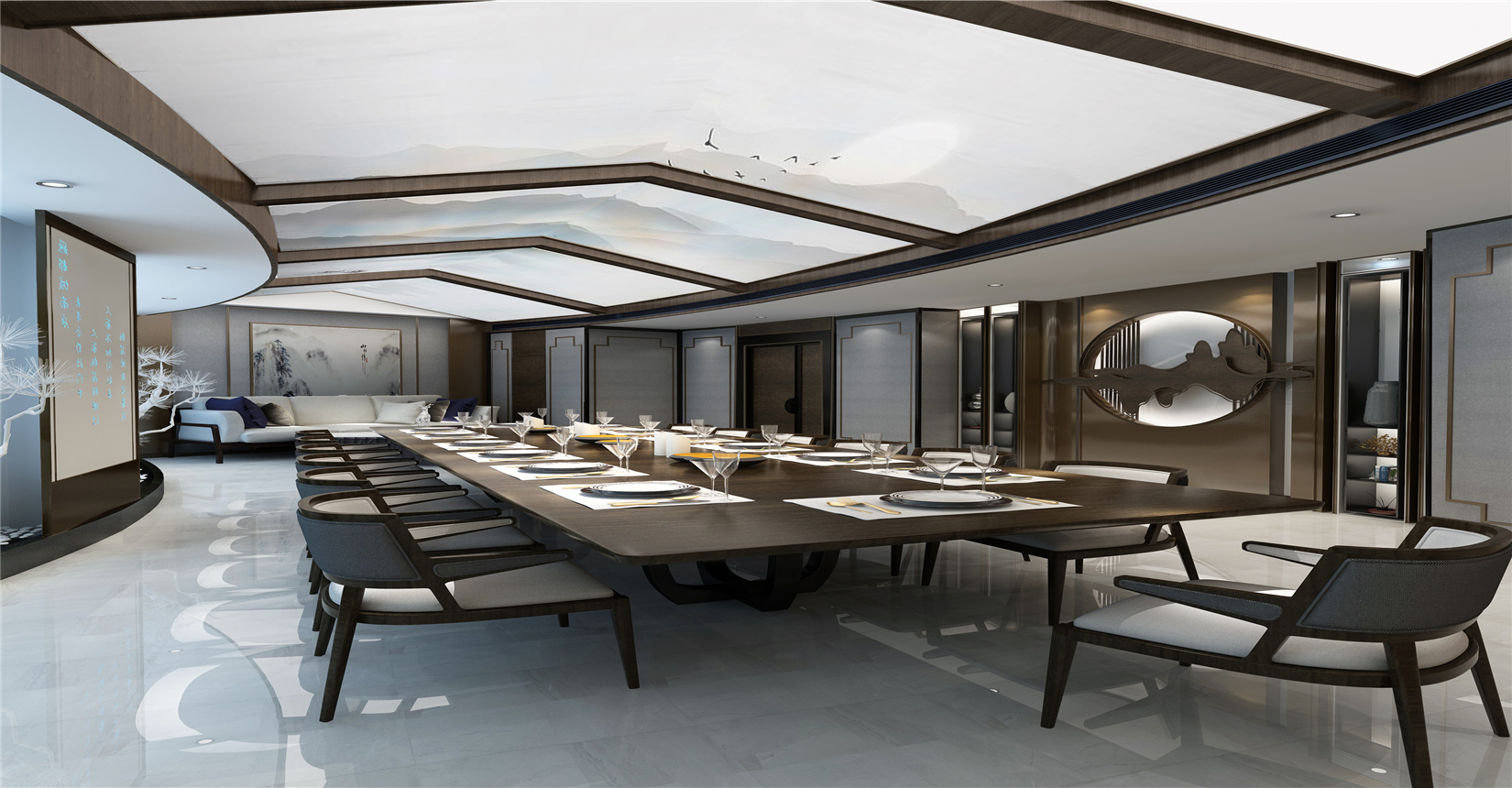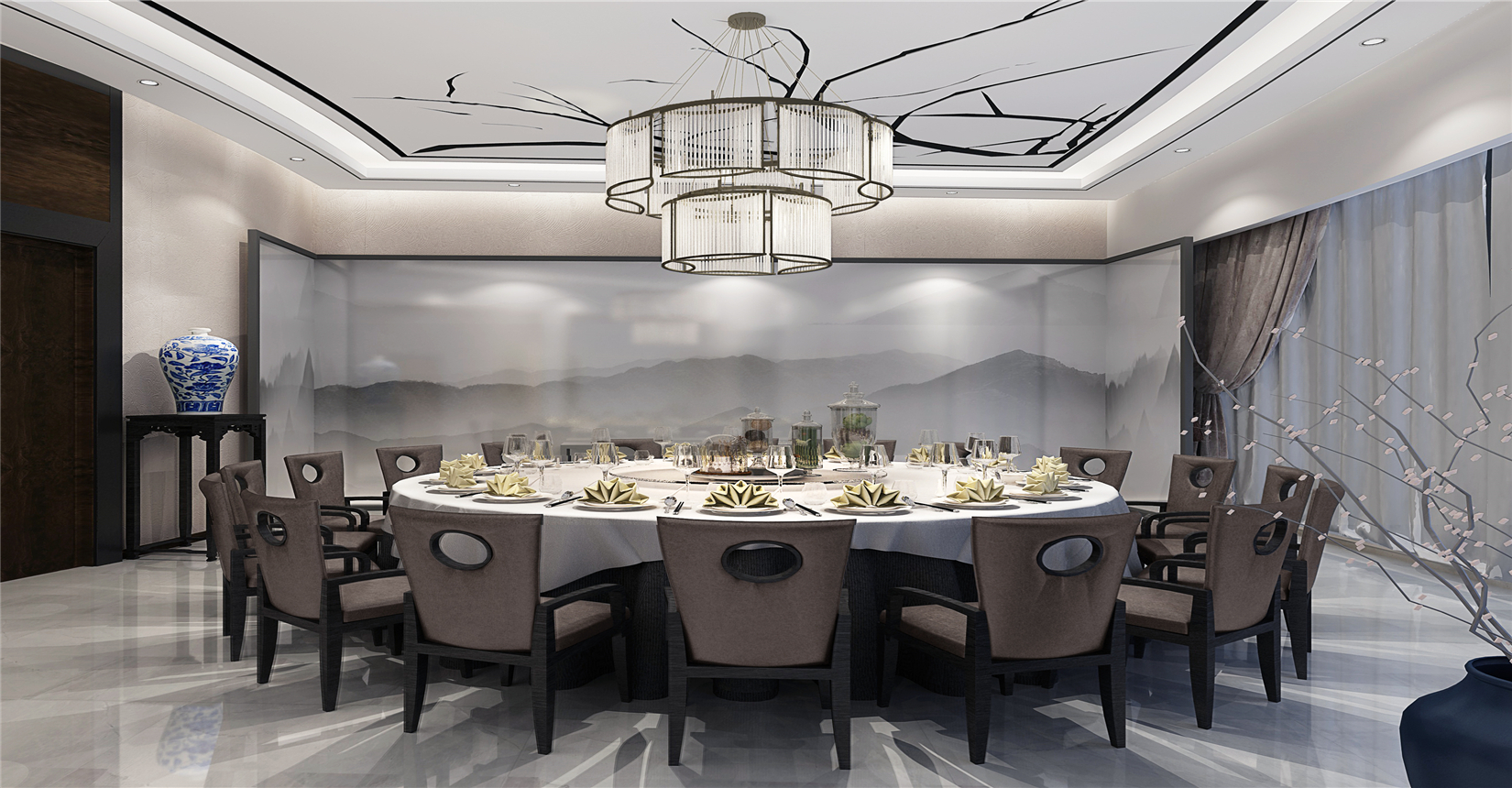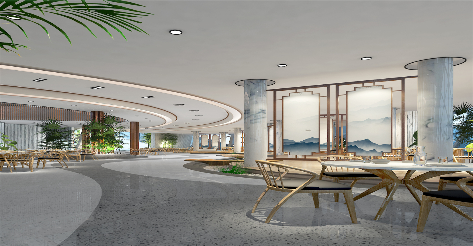 餐廳定位區(qū)別于傳統(tǒng)私人生態(tài)農(nóng)莊、農(nóng)家樂,需要更多結(jié)合智慧、科技、現(xiàn)代元素打造生態(tài)內(nèi)核,因此創(chuàng)新性地使用新東方主義設計風格,將東方地域特色的典雅韻味植入于餐廳環(huán)境。在材料的使用上,多使用如花崗玉、裝飾纖維水泥板、仿古磚、防腐木地板等自然材料,突出餐廳的整體生態(tài)氛圍。