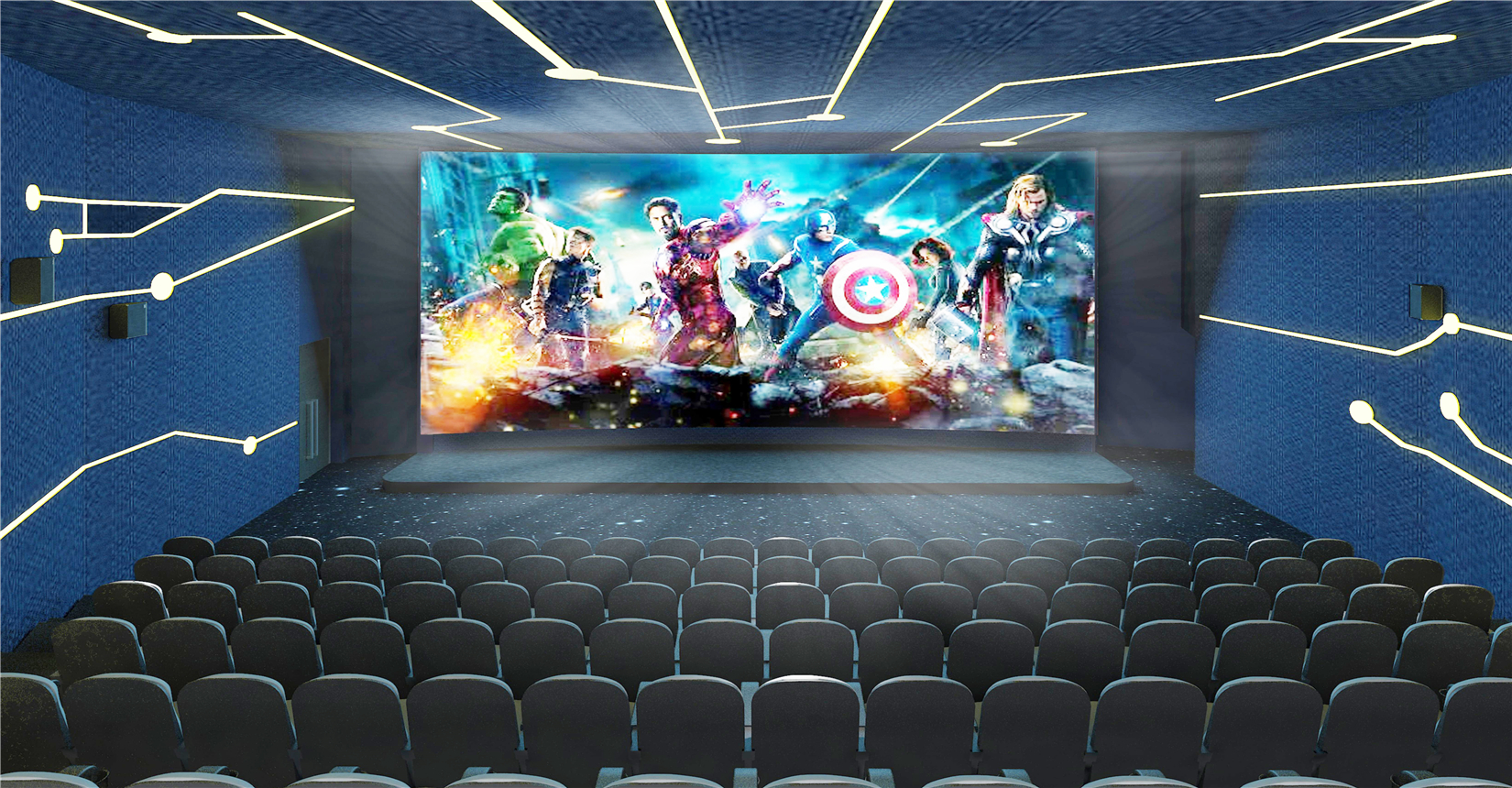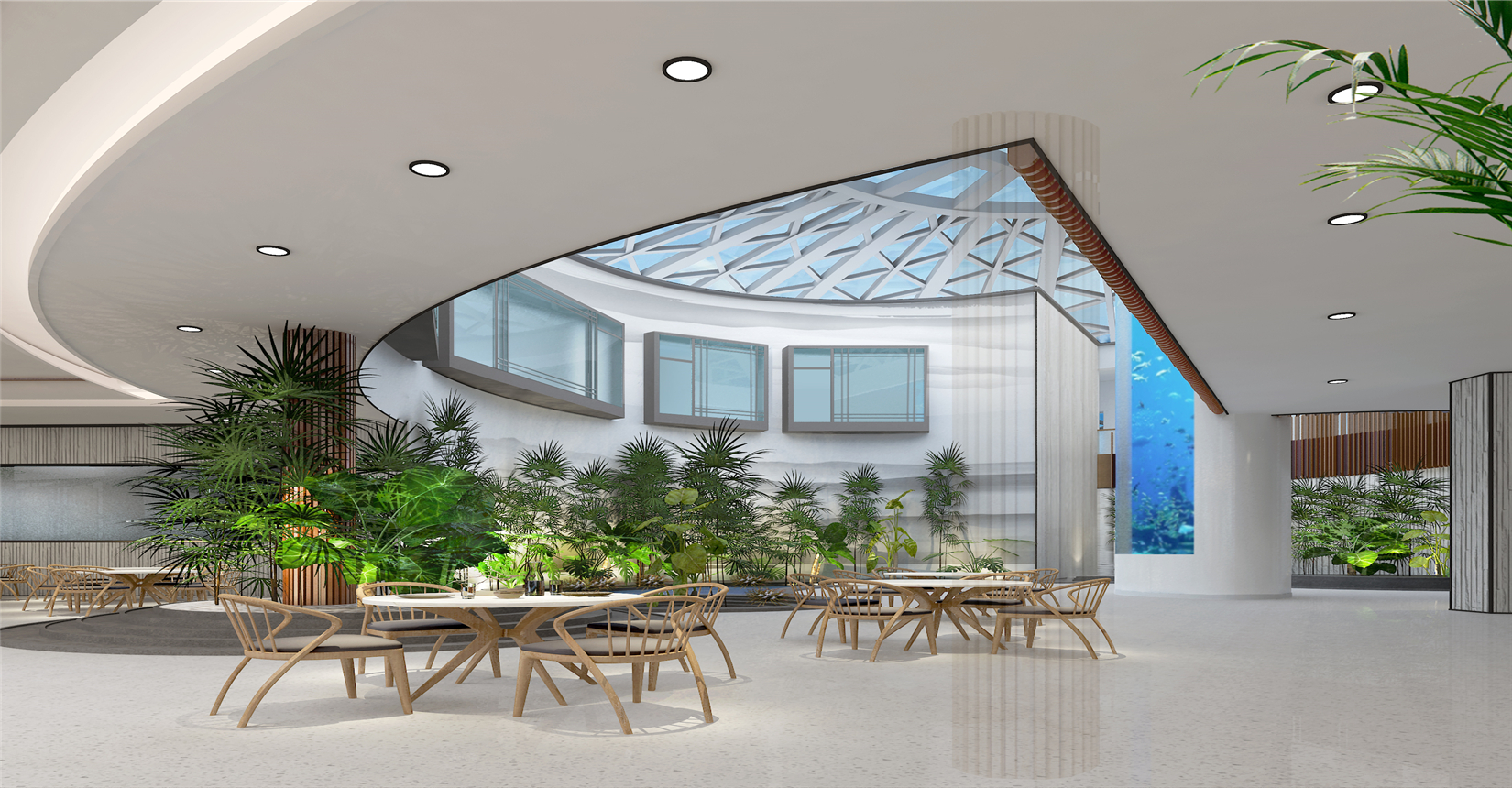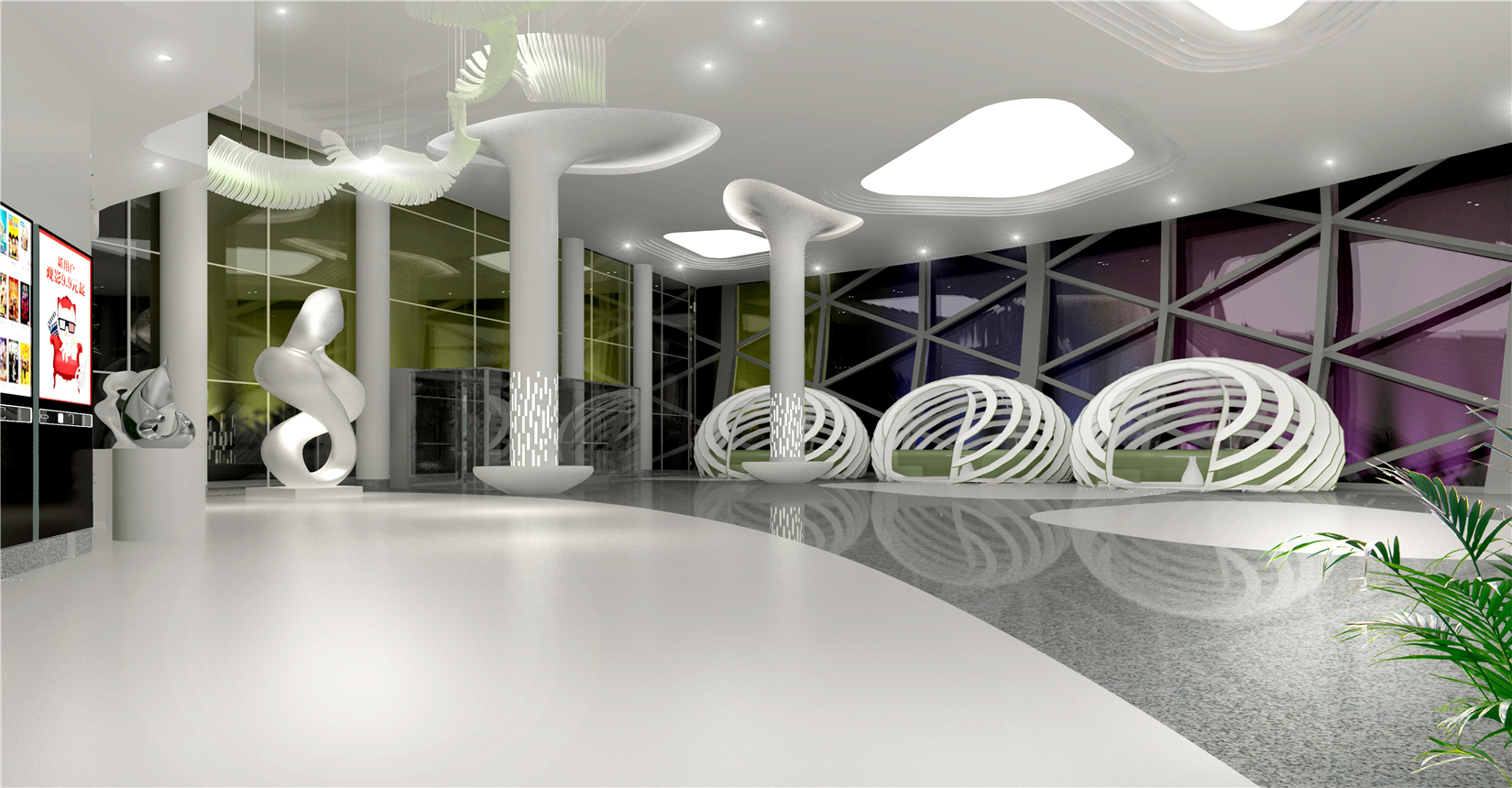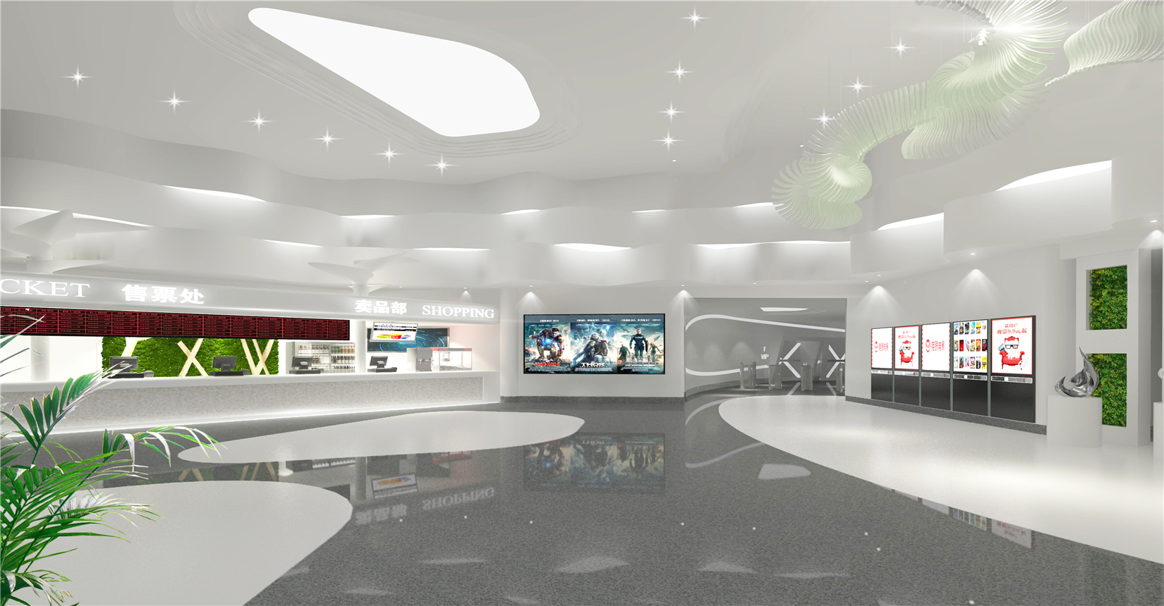 電影院在內(nèi)部空間造型設計上延續(xù)建筑外立面海螺鋼結(jié)構(gòu)美感,以連貫性曲線為特征,做到內(nèi)外形式美感相呼應。以白色金屬板材、白色系魔石地坪及綠色植物垂直造景墻面為主材,全方面打造契合濕地文化主題的生態(tài)景觀體系影城。