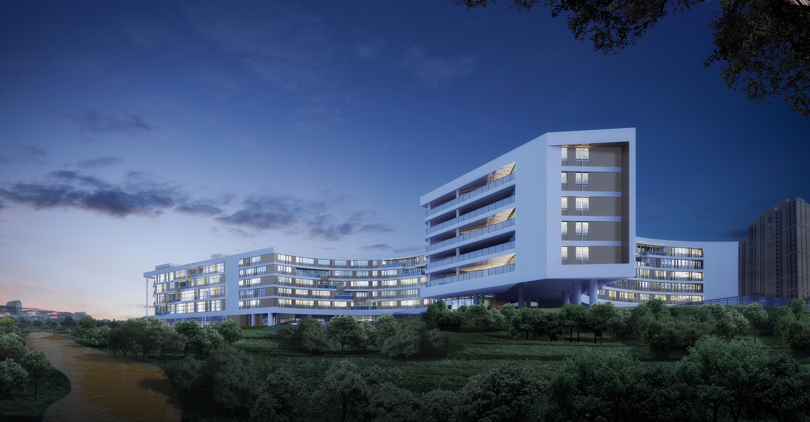 考慮到用地形狀、使用功能和日照等條件因素的影響,總平面布局以“生長”為主題,寓意生命向上生長的力量,生生不息,無限伸展。枝杈無限分支向上生長,象征著無限的力量與生機(jī)。而中醫(yī)的健康講究氣血通暢,循環(huán)往復(fù),從而衍生出“五行”相輔相成的設(shè)計(jì)理念。根據(jù)五行方位確定五行主題。將金水湖與建筑相融合,金水湖為“水”,輔“金”“木”“火”“土”四個(gè)主題廣場。